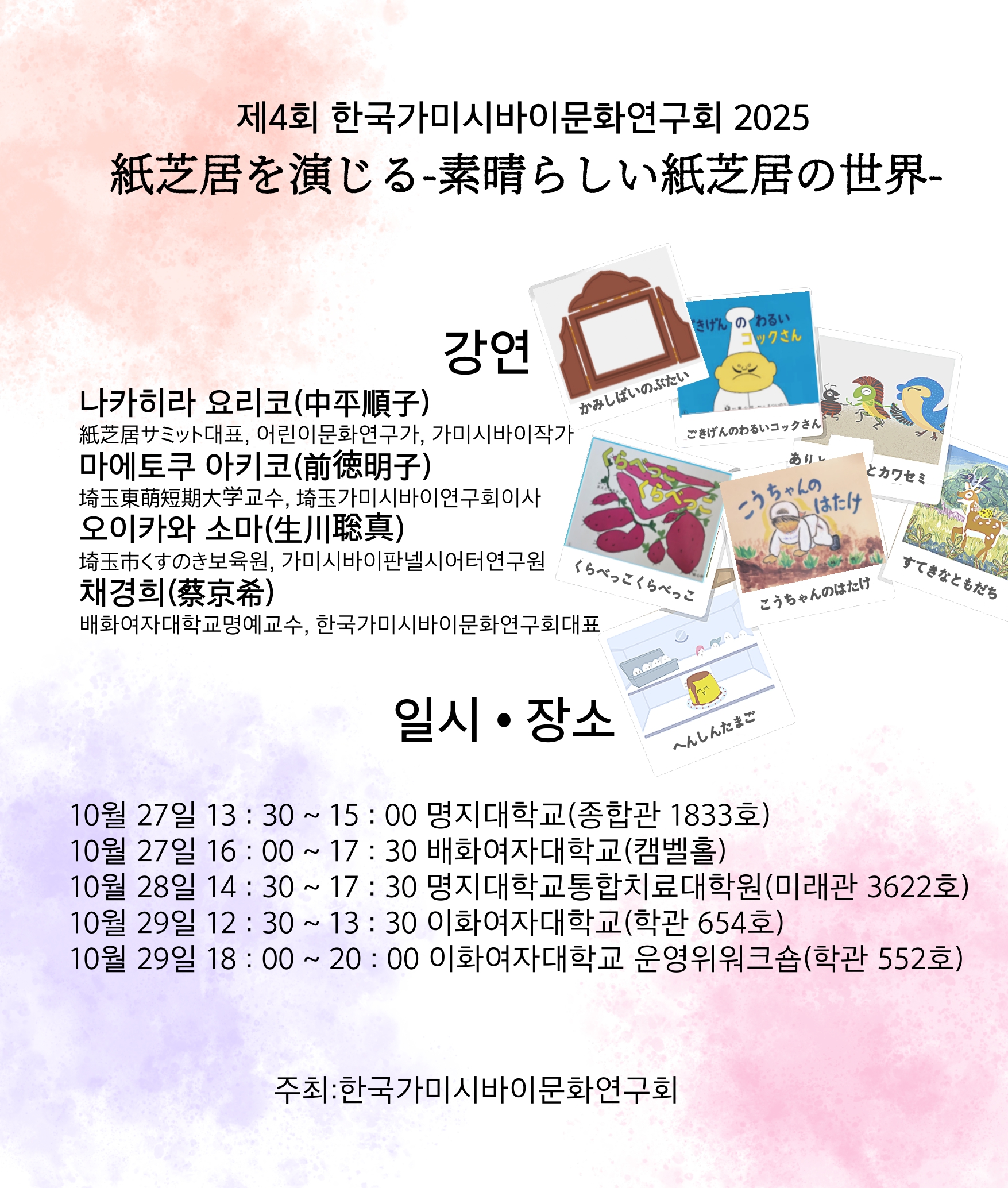가미시바이는 간단한 무대장치에 하나의 이야기로 구성된 여러 장의 그림을 넣어 이를 순차적으로 빼면서 이야기를 구연하는 그림연극입니다.
