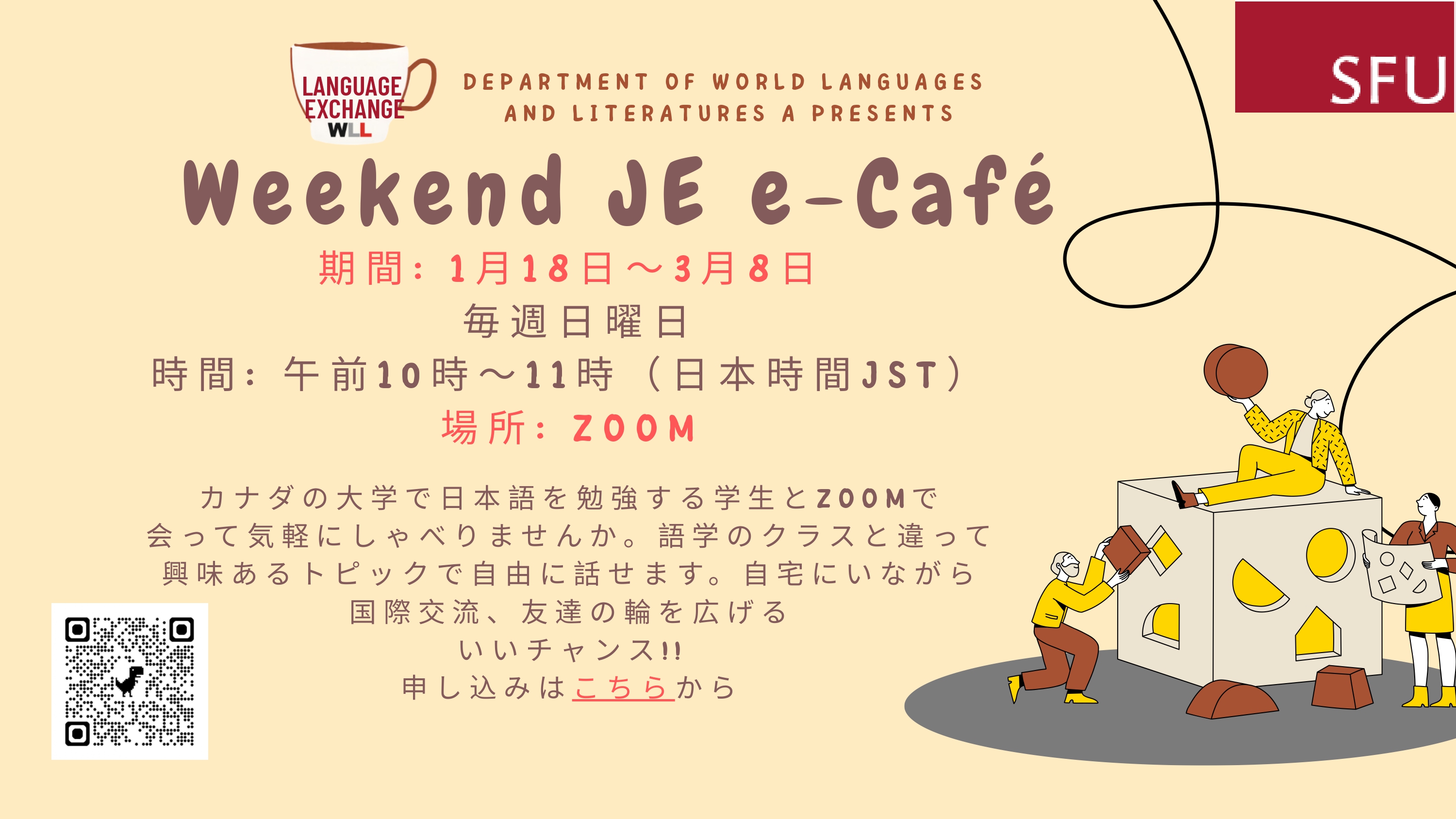 캐나다 사이먼프레이저대학교(SFU) World Languages and Literatures 학부가 주최하는 주말 언어 교환 세션(영어 또는 일본어)에 참여하세요!