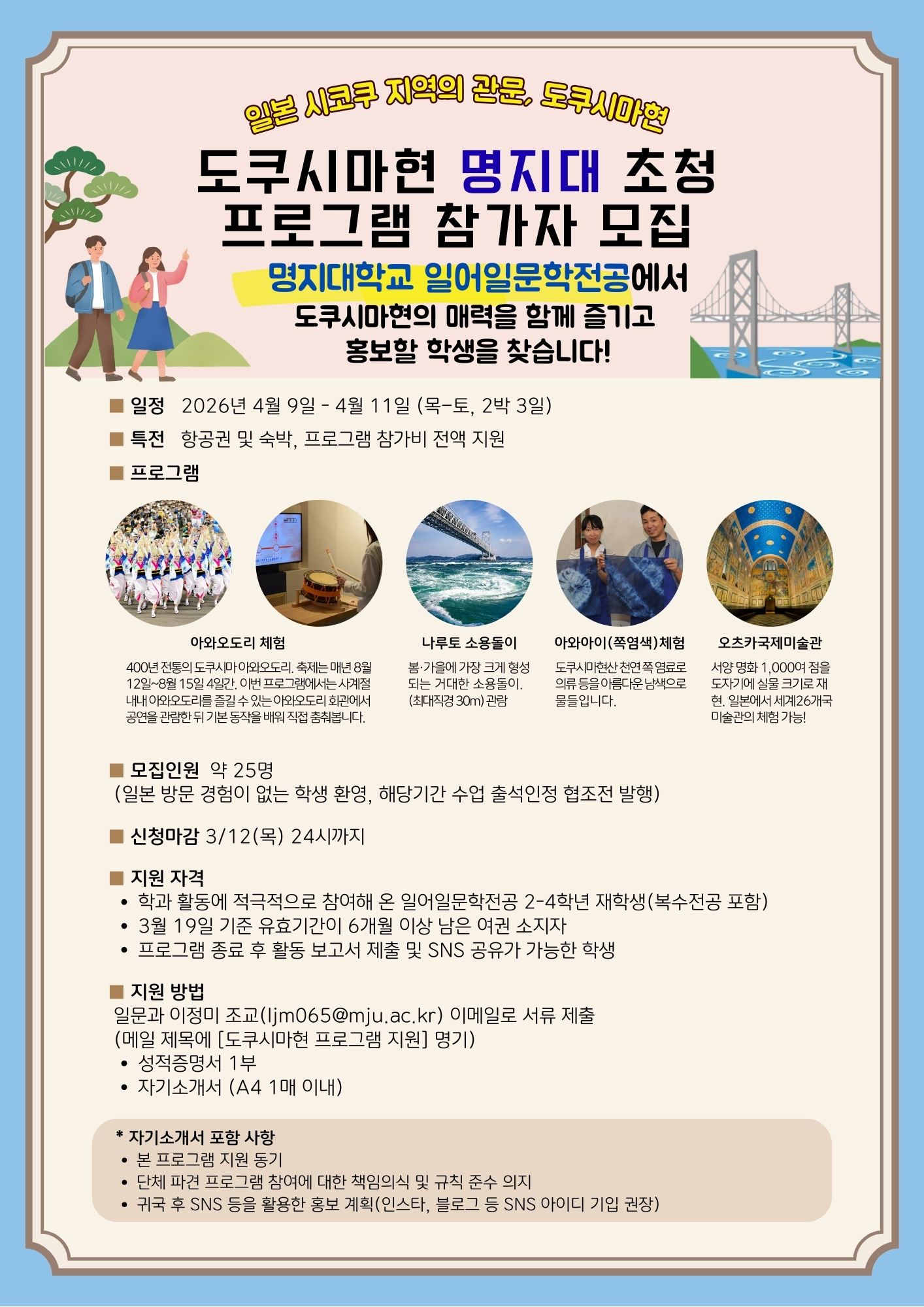 ■ 지원 방법-일문과 이정미 조교(ljm065@mju.ac.kr) 이메일로 3월 12일 24시까지 서류 제출(메일 제목에 [도쿠시마현 프로그램 지원] 명기)